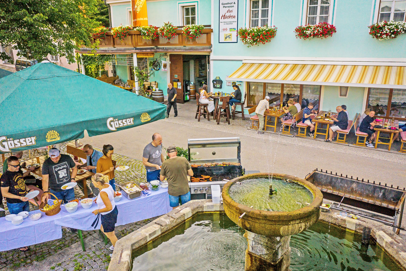 Das Waldviertel ist ein Geheimtipp unter Genussfahrern. Kaum frequentierte Straßen, endlose Kurven durch sanfte Hügellandschaft und eine Ruhe, die man heute selten findet. Im Yspertal, eingebettet von fünf Eintausendern, liegt der Gasthof Drei Hacken direkt am idyllischen Marktplatz.